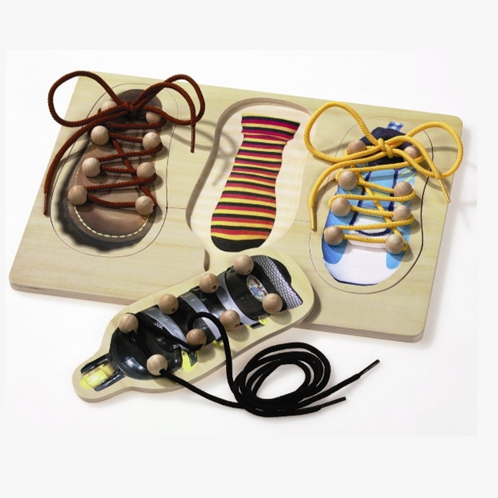 Σε ξύλινη βάση υπάρχουν 3 μοντέλα παπουτσιών. Οι μαθητές χρησιμοποιούν τα κορδόνια και μαθαίνουν να περνούν το κορδόνι και να το δένουν με 3 διαφορετικούς τρόπους.