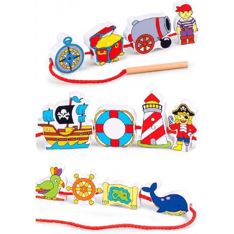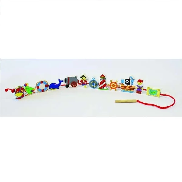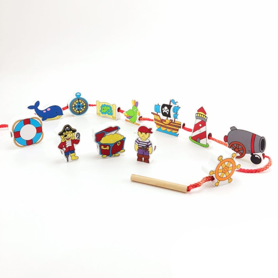 Ξύλινα Σχήματα με Κορδόνι – Πειρατές Ιδανικό για να δημιουργήσουν τα παιδιά ιστορίες και να τις αφηγηθούν καθώς βλέπουν την σειρά των ξύλινων κομματιών. Κάθε σετ περιλαμβάνει 12 ξύλινα κομμάτια και ένα κορδόνι. Κάθε κομμάτι είναι βαμμένο και από τις δύο πλευρές και το κορδόνι συνδέεται με μια μικρή ξύλινη ράβδο για να το περνούν εύκολα τα παιδιά από τις τρύπες των ξύλινων κομματιών. Μέσο ύψος κομματιών 6cm.