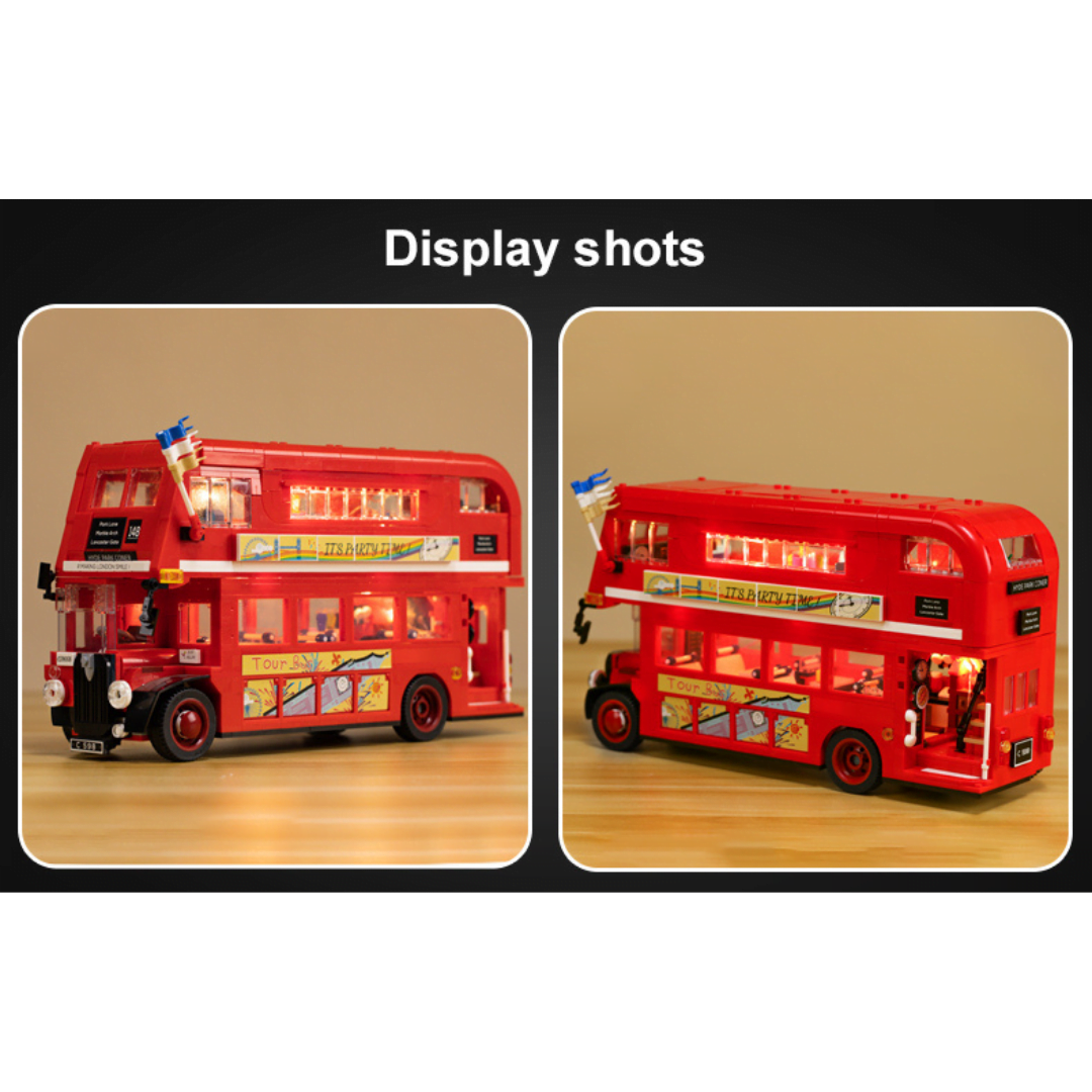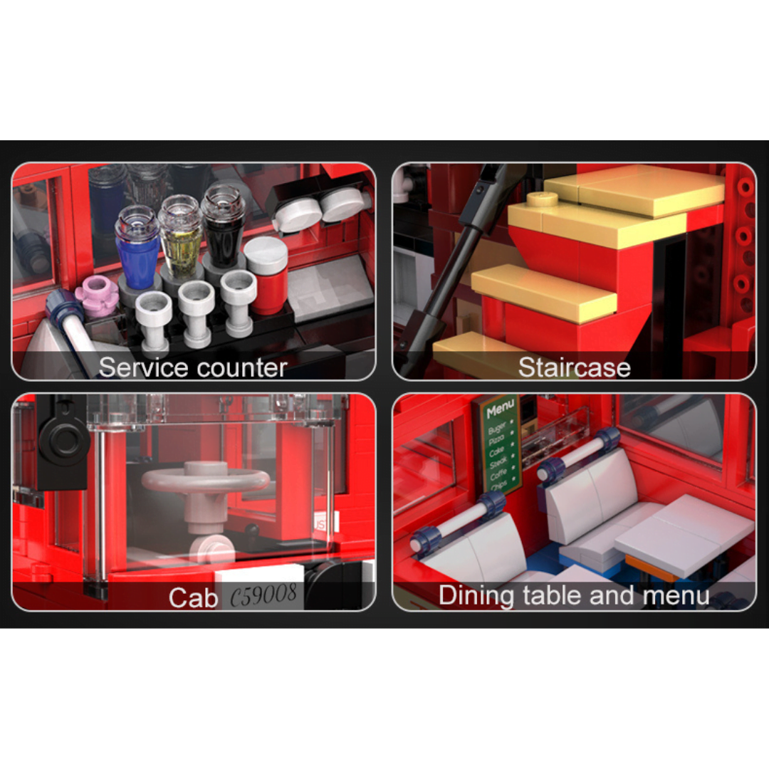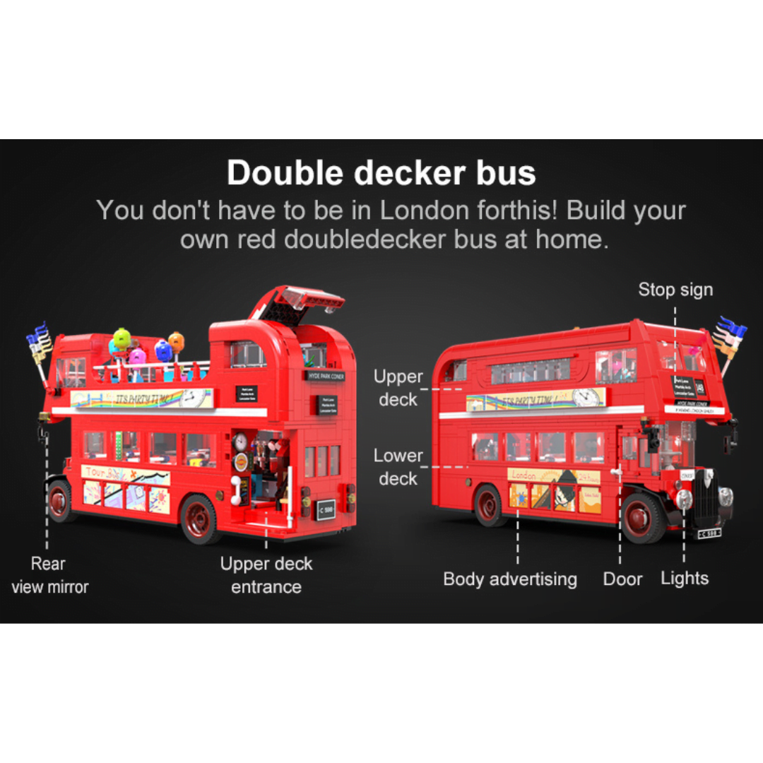Δεν χρειάζεται να βρίσκεστε στο Λονδίνο για να ‍φτιάξτε το δικό σας London Vintage Tour Bus CaDa ! Τα λεωφορεία του Λονδίνου φημίζονται για τον εμβληματικό σχεδιασμό τους, και αυτό δεν διαφέρει. Το London Vintage Tour Bus διαθέτει διπλό κατάστρωμα με εξωτερικό παλιό και ανοιγόμενο επάνω κατάστρωμα. Θα βρείτε και ένα ανοιχτό πίσω χώρο επιβίβασης με σκάλες που οδηγεί στο ανώτερο κατάστρωμα περιήγησης που είναι το ιδανικό μέρος για πάρτι. Το επάνω κατάστρωμα είναι ειδικά εξοπλισμένο με μίξερ DJ και ηχεία, ώστε να μπορείτε να απολαύσετε τη μουσική ενώ κάθεστε σε αυτόν τον άνετο καναπέ. Αλλά το κάτω κατάστρωμα είναι όπου αρχίζει όλη η διασκέδαση! Υπάρχει ένα κοκτέιλ μπαρ, με πάγκο εξυπηρέτησης και τραπεζαρίες τοποθετημένες δίπλα στα παράθυρα για να απολαύσετε την υπέροχη θέα του Λονδίνου. Για να κάνουμε τη βόλτα σας με το λεωφορείο λίγο πιο συναρπαστική, παραλαμβάνεται USB LED που μπορούν να φωτίσουν το λεωφορείο με 8 διαφορετικά εφέ. Βαθμός δυσκολίας: μέτριος Κομμάτια: 1770 Διαστάσεις Λεωφορείου: 34.6*12*19.9cm