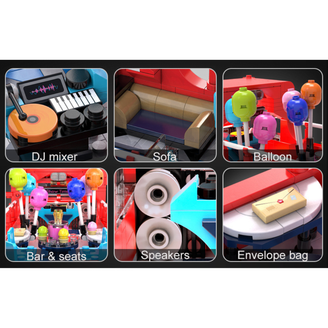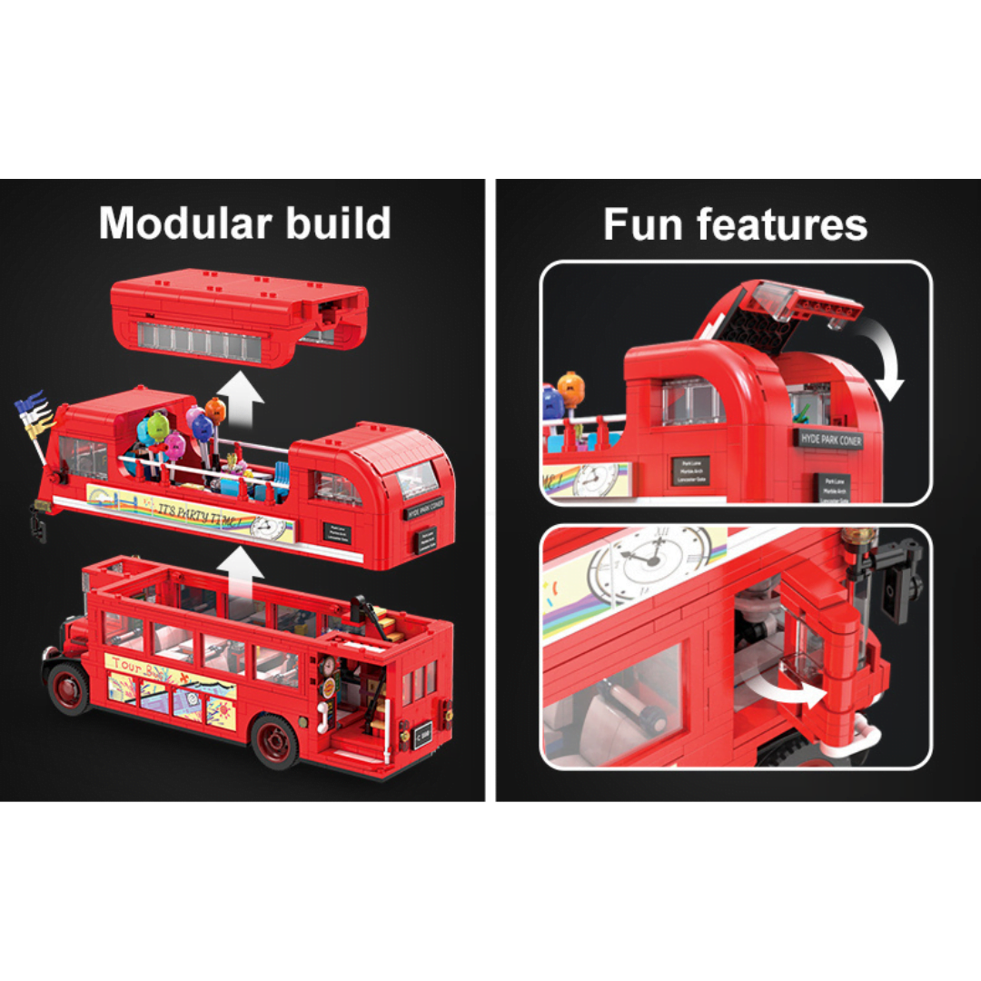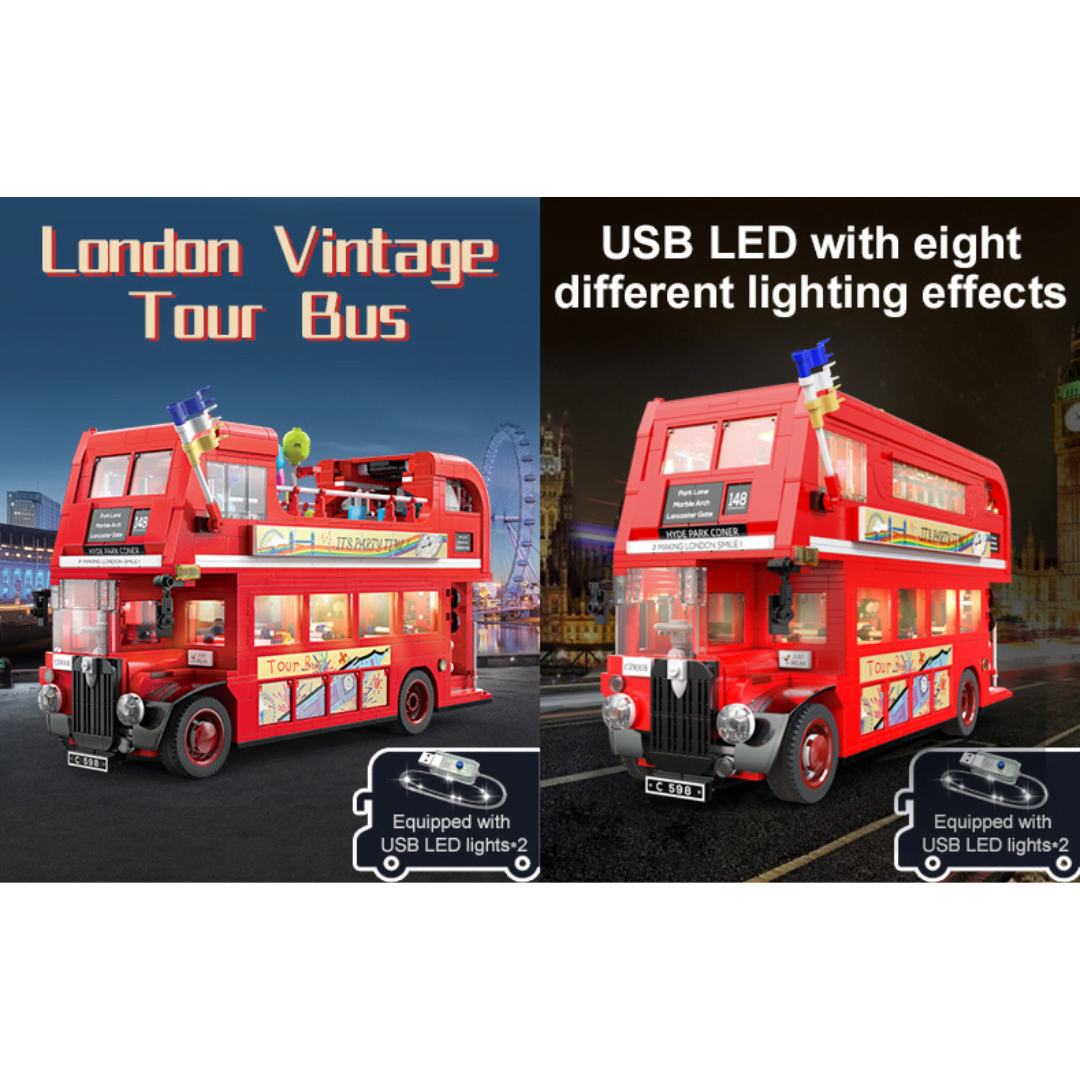 Δεν χρειάζεται να βρίσκεστε στο Λονδίνο για να ‍φτιάξτε το δικό σας London Vintage Tour Bus CaDa ! Τα λεωφορεία του Λονδίνου φημίζονται για τον εμβληματικό σχεδιασμό τους, και αυτό δεν διαφέρει. Το London Vintage Tour Bus διαθέτει διπλό κατάστρωμα με εξωτερικό παλιό και ανοιγόμενο επάνω κατάστρωμα. Θα βρείτε και ένα ανοιχτό πίσω χώρο επιβίβασης με σκάλες που οδηγεί στο ανώτερο κατάστρωμα περιήγησης που είναι το ιδανικό μέρος για πάρτι. Το επάνω κατάστρωμα είναι ειδικά εξοπλισμένο με μίξερ DJ και ηχεία, ώστε να μπορείτε να απολαύσετε τη μουσική ενώ κάθεστε σε αυτόν τον άνετο καναπέ. Αλλά το κάτω κατάστρωμα είναι όπου αρχίζει όλη η διασκέδαση! Υπάρχει ένα κοκτέιλ μπαρ, με πάγκο εξυπηρέτησης και τραπεζαρίες τοποθετημένες δίπλα στα παράθυρα για να απολαύσετε την υπέροχη θέα του Λονδίνου. Για να κάνουμε τη βόλτα σας με το λεωφορείο λίγο πιο συναρπαστική, παραλαμβάνεται USB LED που μπορούν να φωτίσουν το λεωφορείο με 8 διαφορετικά εφέ. Βαθμός δυσκολίας: μέτριος Κομμάτια: 1770 Διαστάσεις Λεωφορείου: 34.6*12*19.9cm