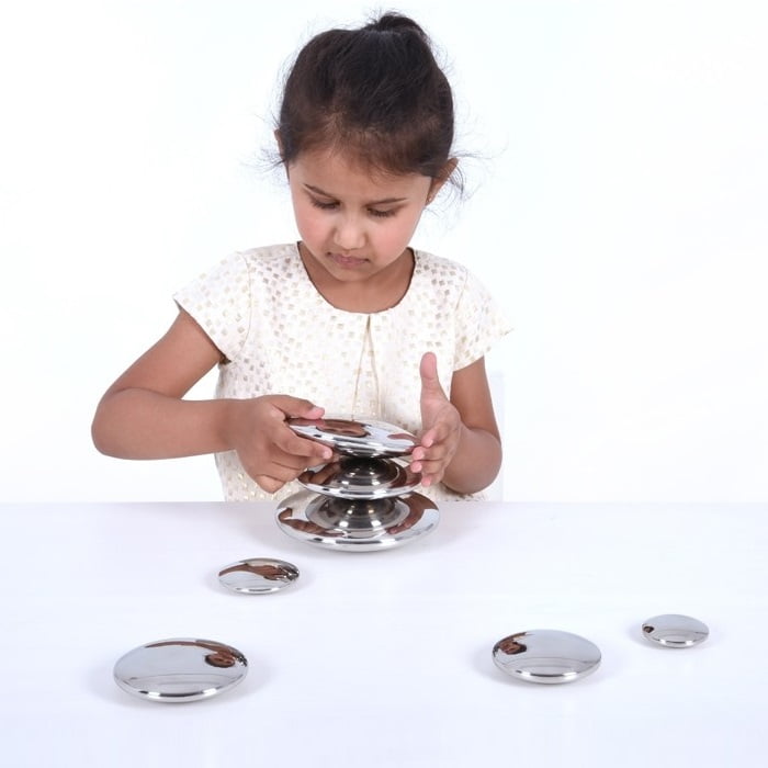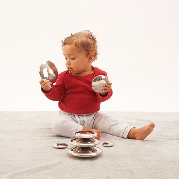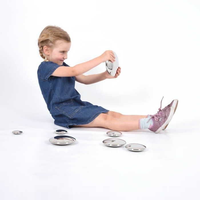 Αυτά τα όμορφα λεία Sensory Ασημί Καθρεπτάκια είναι κατασκευασμένα από σκληρό ανοξείδωτο ατσάλι, με διαμέτρους από 50mm έως 140mm και έχουν σχήμα στρογγυλεμένου δίσκου (σαν μεγάλα κουμπιά) με στρογυλλεμένες και λείες άκρες.
