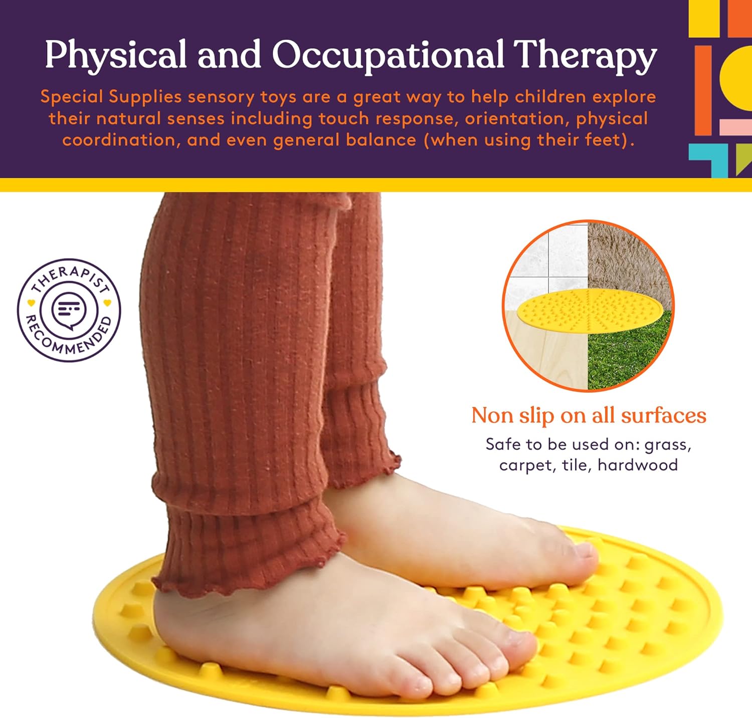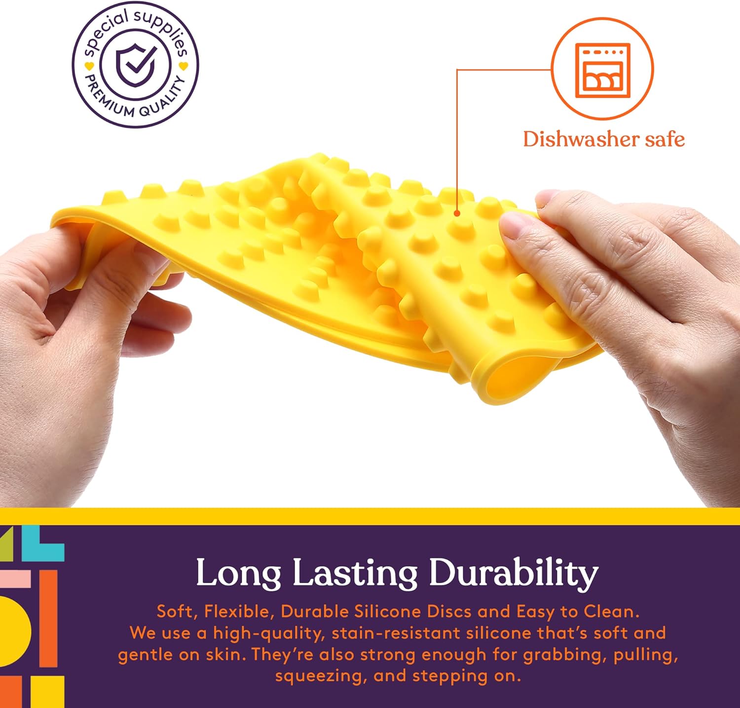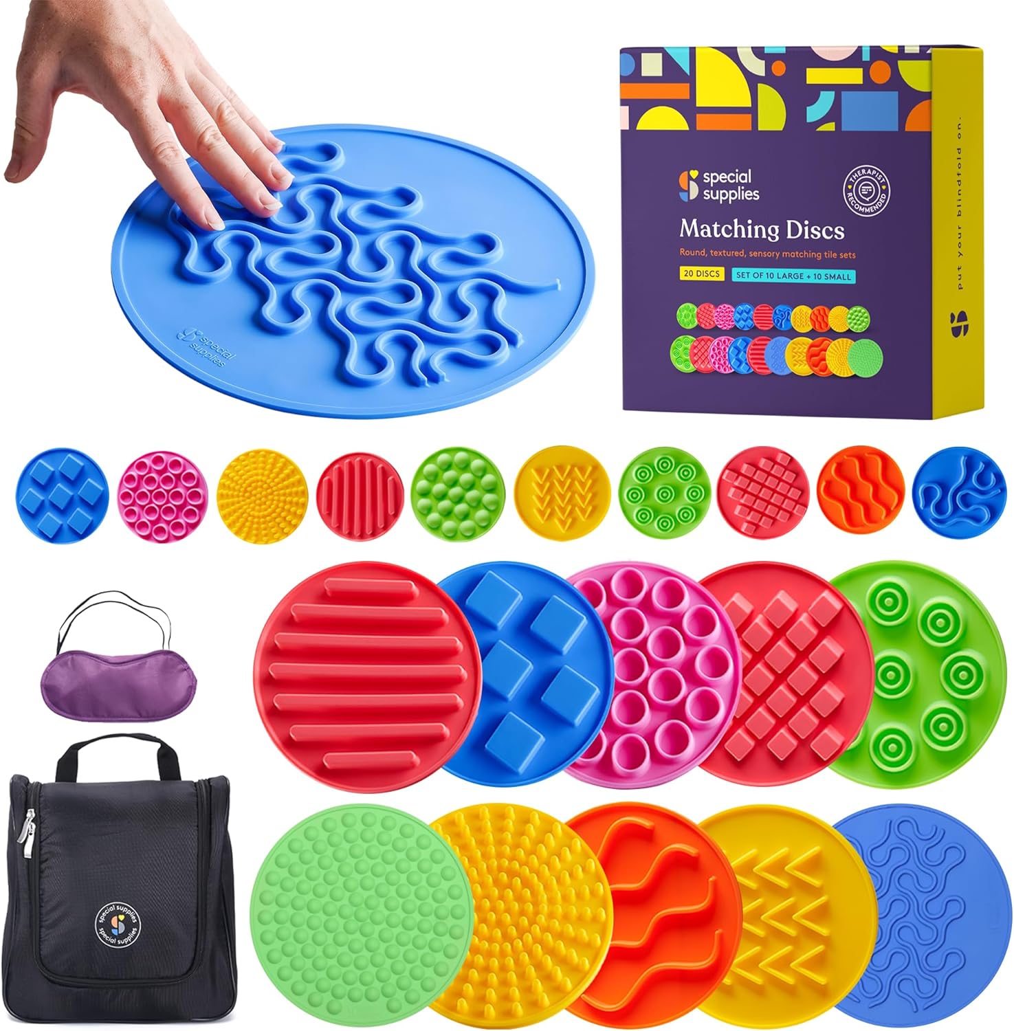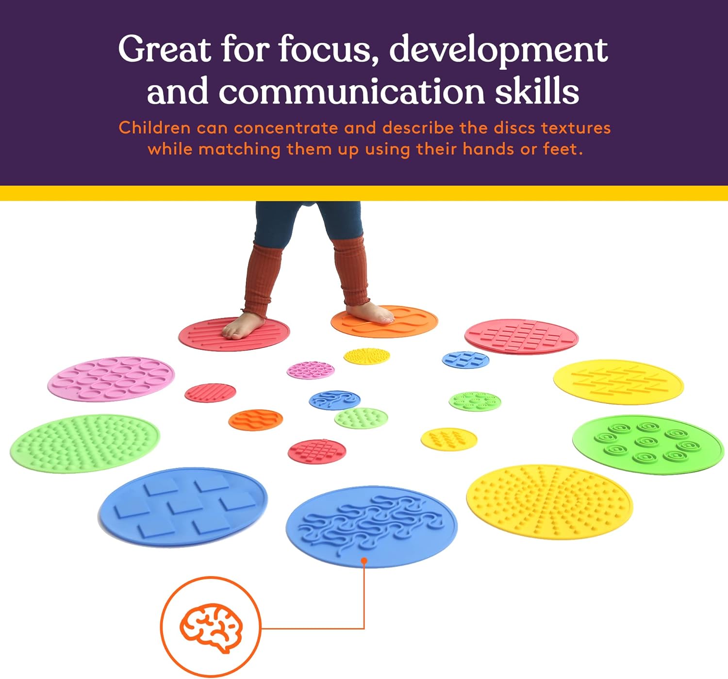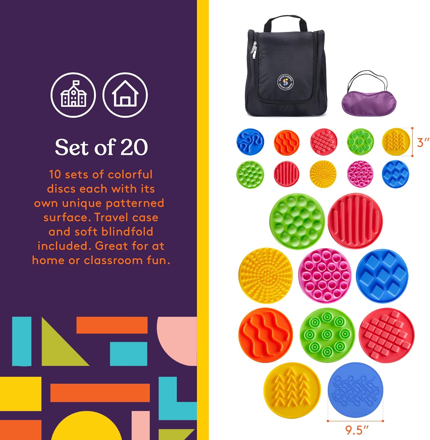 Sensory Κύκλοι Σιλικόνης Σετ 20 Αυτό το σετ αποτελείται από 20 ανάγλυφους κυκλικούς δίσκους κατασκευασμένους από εξαιρετικά μαλακή εύκαμπτη σιλικόνη – 10 μεγάλους και 10 μικρούς. Στην επιφάνεια κάθε κύκλου υπάρχει ένα μοτίβο το οποίο είναι διακριτικό και διαφορετικό από το υπόλοιπο σετ. Τα παιδιά μπορούν να αισθανθούν αυτές τις υφές και να ανακαλύψουν τις διαφορές τους: τοποθετώντας τους μικρούς κύκλους στη λευκή βαμβακερή τσάντα που παρέχεται, μπορούν να δουν αν μπορούν να περιγράψουν ή να προβλέψουν το μοτίβο που αισθάνονται. Ή χρησιμοποιώντας τα πόδια τους μπορούν να περπατήσουν πάνω από τους μεγάλους αισθητηριακούς κύκλους για να δουν αν μπορούν να τους ξεχωρίσουν. Η σύνδεση των μικρών και των μεγάλων αισθητηριακών κύκλων μέσω της αφής είναι επίσης πολύ διασκεδαστική, με ή χωρίς δεμένα μάτια. Η σιλικόνη έχει μερικές εξαιρετικές ιδιότητες που την καθιστούν το ιδανικό υλικό για αισθητηριακούς κύκλους – είναι ισχυρή, ασφαλής στο χειρισμό και εξαιρετικά μαλακή στην αφή. Στο πάτωμα, οι κύκλοι βεντουζώνουν και δεν θα γλιστρούν ακόμη και σε μια γυαλιστερή επιφάνεια ενώ μετά τη χρήση μπορούν να πλυθούν με το χέρι ή να μπουν σε ένα πλυντήριο πιάτων χωρίς να πάθουν κάτι. Περιλαμβάνει και μια μαλακή υφασμάτινη μάσκα προσώπου Διαστάσεις: Μεγάλος κύκλος 25cm και μικρός κύκλος 10cm. Tο σετ συνοδεύεται από μια μαύρη βαμβακερή τσάντα Ηλικία: Κατάλληλο από 3 ετών και άνω.