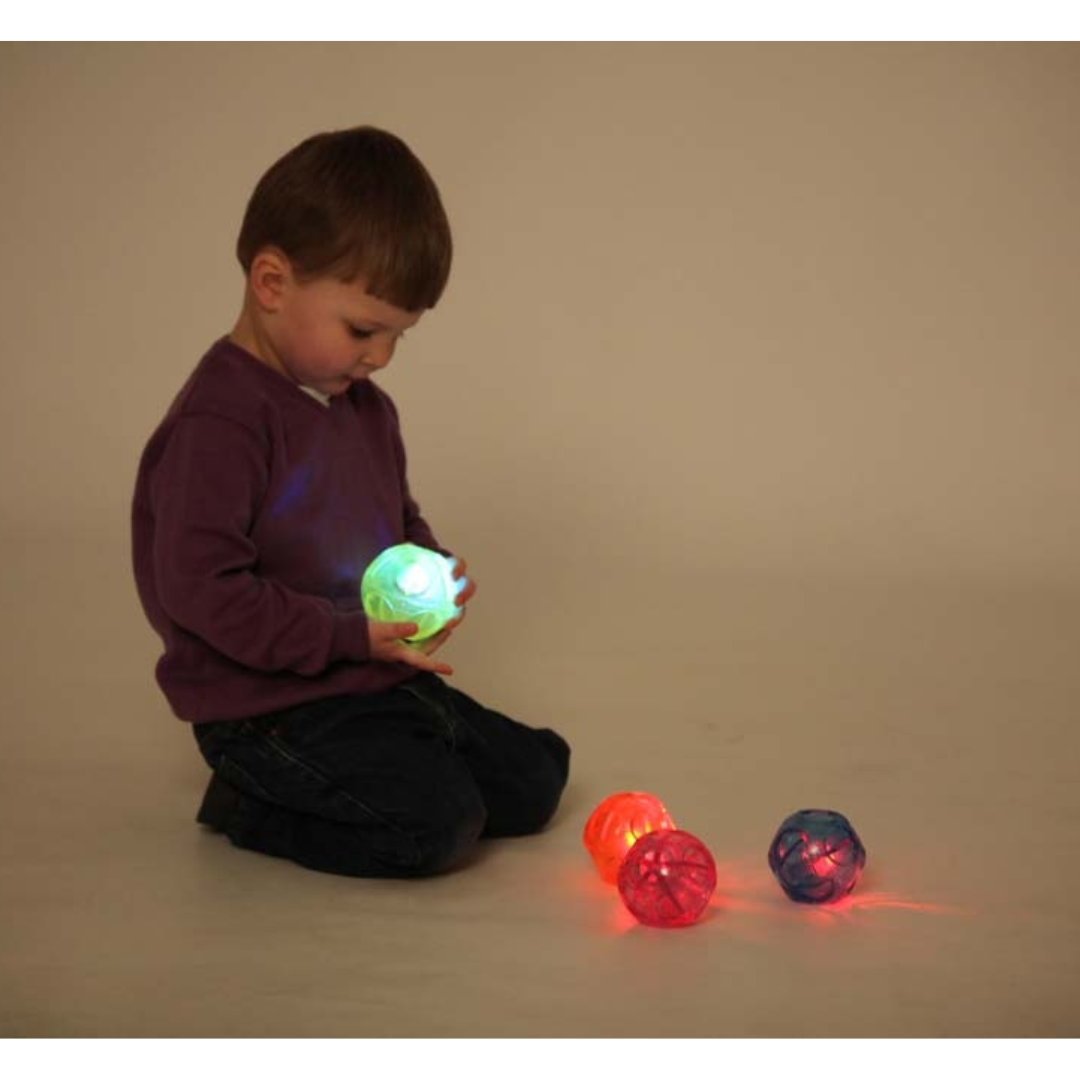 Τα παιδιά θα λατρέψουν να παίζουν με αυτές τις αισθητηριακές ακανόνιστες μπάλες αναπήδησης που ανάβουν και αναβοσβήνουν όταν πέφτουν. Ιδανικά για χρήση σε αισθητηριακό χώρο ή για παιχνίδια ρίψης και σύλληψης, καθώς είναι το τέλειο μέγεθος για το χέρι ενός μικρού παιδιού. Οι μπάλες έχουν ανώμαλες επιφάνειες και εκτρέπονται σε περίεργες γωνίες όταν αναπηδούν.