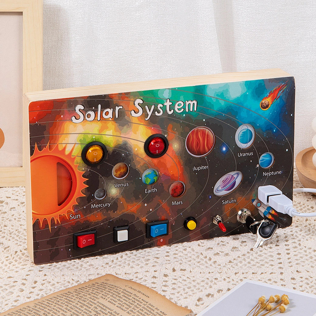 Ξύλινο Montessori Busy Board με LED – Ηλιακό Σύστημα
